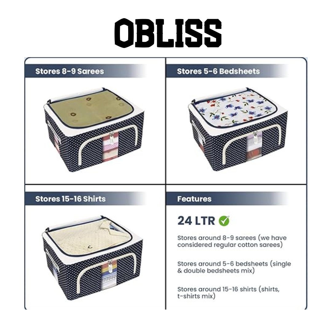 - STORAGE BOXES FOR CLOTHES – The obliss foldable storage bags are made of premium oxford fabric. These storage bags for clothes are the perfect way to store not just those expensive sarees and exquisite gowns but also your ironed clothes, woollens, bed sheets, quilts etc. Built on strong metal frame structure, they are quite sturdy and fits perfectly into your wardrobe